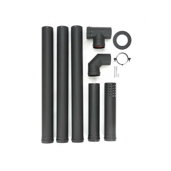 Complete set - met 4 buizen (3 x 100 cm + 1 x 50 cm), T-stuk met deksel, 1 bocht (90°), beugel, windscherm, ring en siliconen afdichting